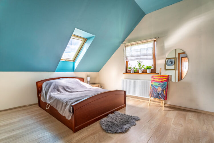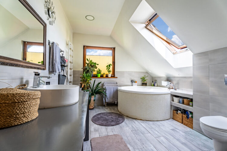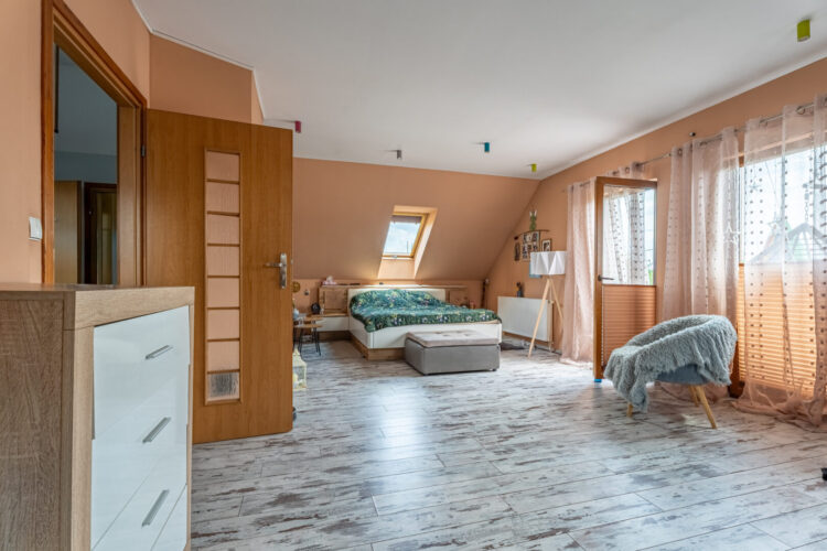 Jej największym atutem jest możliwość prostego podziału na dwa osobne, mniejsze pokoje dla dzieci. Na piętrze znajduje się też drugi pokój, pojemna garderoba oraz duża, rodzinna łazienka z wanną.