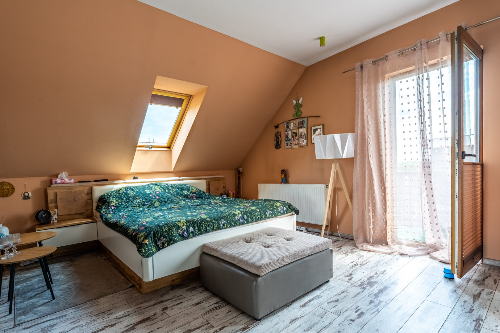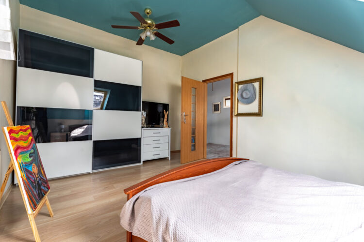 Na piętro prowadzą wygodne schody. Znajdziemy tam strefę prywatną, a w niej dużą, ustawną sypialnię główną z wyjściem na balkon.