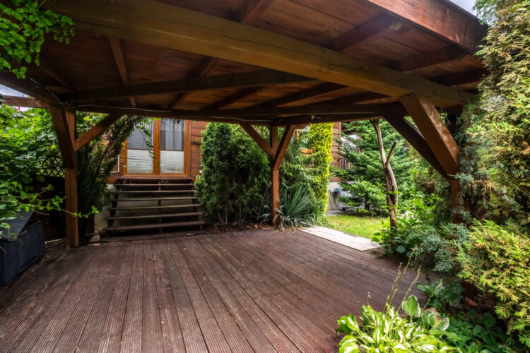 W ogrodzie znajduje się basen, a tuż obok duży, zadaszony taras – idealne miejsce do wypoczynku.