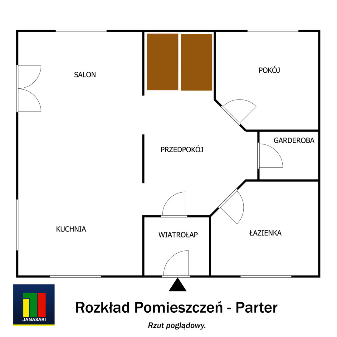 Parter: duży salon z wyjściem na taras, otwarta kuchnia, pokój (gabinet/sypialnia), łazienka z prysznicem, garderoba, wiatrołap, przedpokój.
